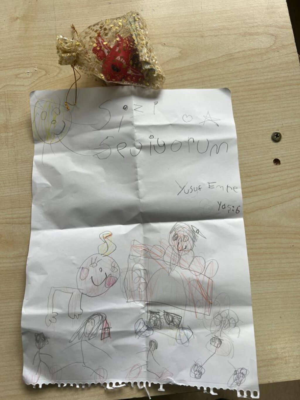 Atakum Belediyesi Paylaşım Merkezi’ne ulaştırdıkları paketlerin yanı sıra bir kese içerisinde harçlığını ve oyuncağını da paylaşan 6 yaşındaki Yunus Emre’nin çizdiği resim ve “Sizi seviyorum” notu merkez personelini duygulandırdı.