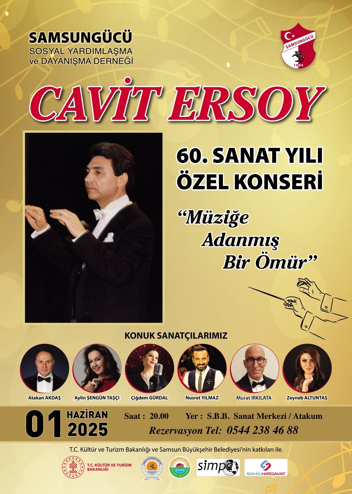 Türk sanat müziğinin kıymetli ismi Cavit Ersoy’un 60. sanat yılı, anlamlı bir konserle taçlandırılıyor. "Müziğe Adanmış Bir Ömür" başlığıyla düzenlenen bu özel gece, 1 Haziran 2025 Pazar günü saat 20.00’de Samsun Büyükşehir Belediyesi Sanat Merkezi’nde sanatseverlerle buluşacak.Samsungücü Sosyal Yardımlaşma ve Dayanışma Derneği’nin öncülüğünde, Kültür ve Turizm Bakanlığı ile Samsun Büyükşehir Belediyesi’nin katkılarıyla organize edilen konser, sadece bir müzik ziyafeti değil; aynı zamanda sanatın bir ömre nasıl ilmek ilmek işlendiğinin saygı duruşu niteliğinde olacak.Cavit Ersoy’a ithafen hazırlanan bu özel gecede, sanat dünyasının sevilen isimleri Atakan Akdaş, Aylin Şengün Taşçı, Çiğdem Gürdal, Nusret Yılmaz, Murat Irklıata ve Zeyneb Altuntaş da sahnede yer alacak.Bir sanatçının hayatına sığdırdığı onlarca yıl, sayısız eser ve unutulmaz anı... Samsun, bu anlamlı gecede sadece bir konseri değil, bir ömrün sanatla nasıl şekillendiğini alkışlayacak.