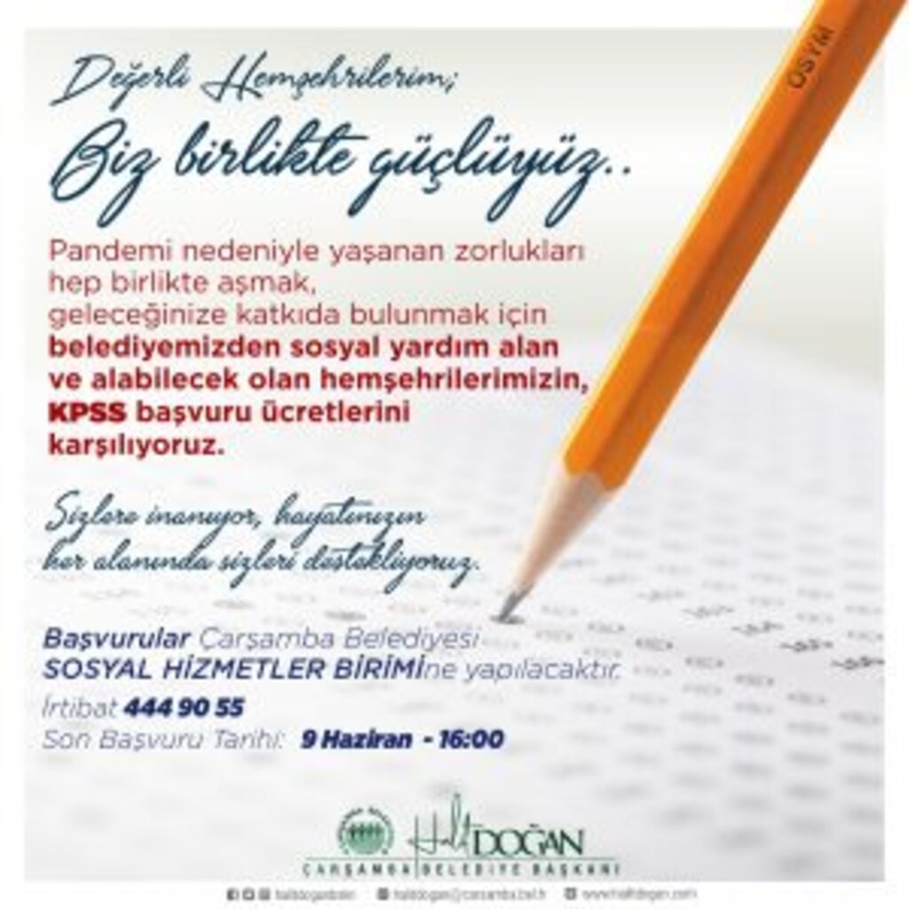 labilecek olan kişilerin KPSS başvuru ücretlerini karşılayacaklarını duyurdu.Sosyal belediyecilik anlayışı ile çalışmalarına devam eden Çarşamba Belediyesi, Kamu Personeli Seçme Sınavı’na (KPSS) gireceklerin sınav ücretlerini karşılayacak. Belediyeden sosyal yardım alan ve alabilecek olan vatandaşlar, Çarşamba Belediyesi Sosyal Hizmetler Birimi’ne, 9 Haziran 2021 saat 16.00’ya kadar başvurularını yapabilecekler.“Eğitime yönelik yapılan her katkı bizim için çok değerli” Eğitime yönelik yapılan her katkının çok değerli olduğunun altını çizen Belediye Başkanı Halit Doğan, “Çarşamba Belediyesi olarak pandeminin yol açtığı zorlukları hep birlikte aşmak, hemşehrilerimizin geleceklerine katkı sunmak adına, belediyemizden sosyal yardım alan ve alabilecek olan kişilerin KPSS başvuru ücretlerini karşılıyoruz. Eğitime yönelik yapılan her katkı bizim için çok değerli. Koronavirüs sebebiyle tüm dünyada bazı zorluklar yaşandı. Biz birlikte çok güçlü bir aileyiz. Yaşanan sıkıntıları birlikte aşmak, vatandaşlarımızın hayatlarına dokunmak için sosyal belediyecilik anlayışı ile çalışmalarımızı sürdürüyoruz. Daha önce de gençlerimizin Yüksek Öğretime Geçiş Sınavı (YKS) ücretlerini karşılamıştık. Gelişen, değişen ve dönüşen toplumların eğitim ile sağlanacağının bilincindeyiz. Bu anlamda çalışmaya devam ediyor, eğitimi destekleyici faaliyetlerimizi sürdürüyoruz” şeklinde konuştu.Başvurular Sosyal Hizmetler Birimi üzerinden alınacakBaşvuruların Çarşamba Belediyesi Sosyal Hizmetler Birimi üzerinden alınacağını ifade eden Başkan Doğan, “Kamu Personeli Seçme Sınavına girecek olan vatandaşlarımız, 9 Haziran 2021 saat 16.00’ya kadar başvurularını, belediyemiz Sosyal Hizmetler Birimi’ne yapılabilecekler. Biz Çarşamba Belediyesi olarak, kıymetli hemşehrilerimize inanıyor ve güveniyor, hayatlarının her alanında destekçileri olmaktan gurur duyuyoruz. Sınava girecek olan vatandaşlarımıza şimdiden başarılar diliyorum. Hayırlısıyla istedikleri puanları alarak hayallerine kavuşurlar inşallah” diyerek sözlerini noktaladı.