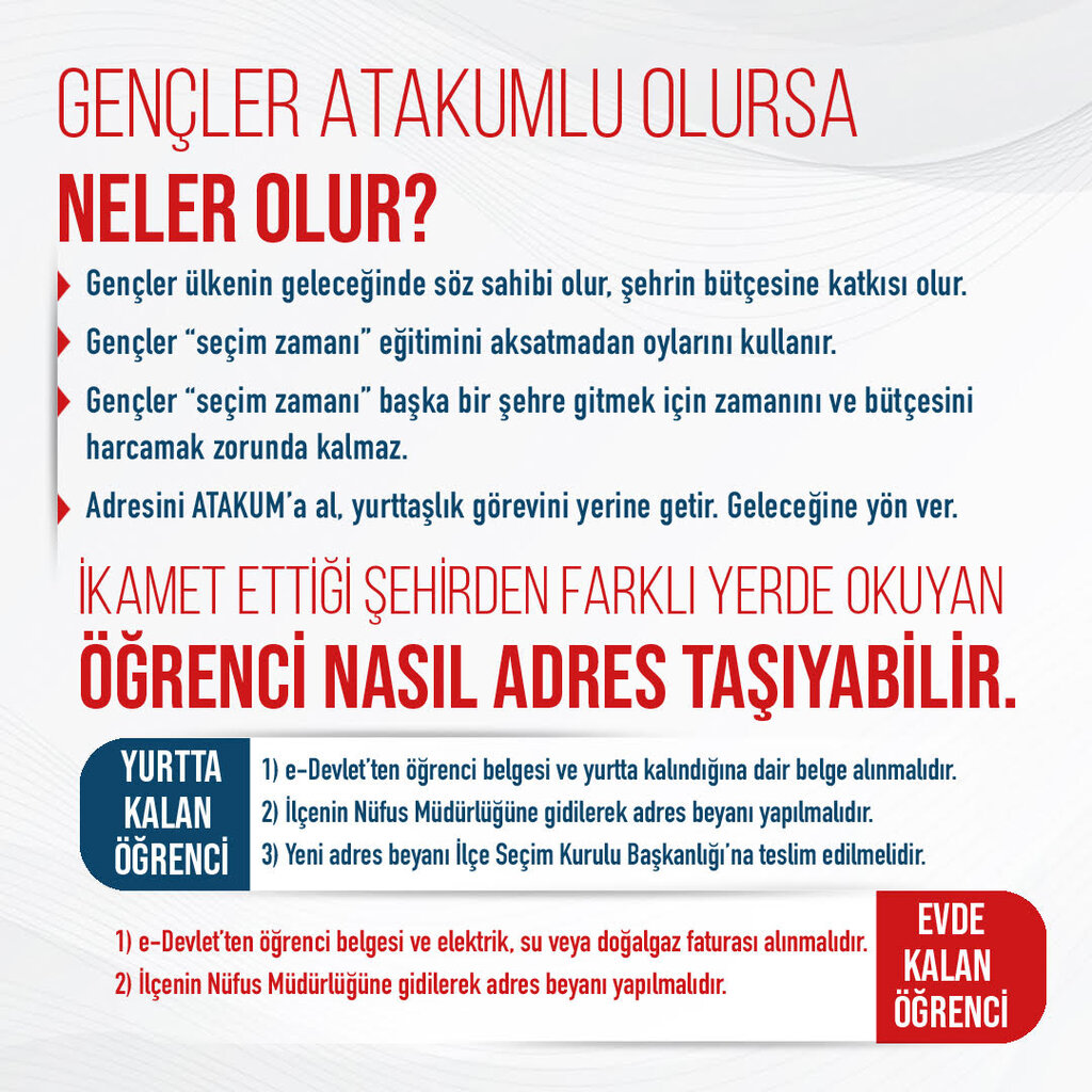Yurttaşlık görevini yerine getirmek ve geleceğine yön vermek isteyen gençler birkaç basit işlemle Atakumlu olabilir. Yurtta kalan öğrenciler e-Devlet’ten alınabilecek öğrenci belgesi ve yurtta kalındığına dair belge ile Atakum İlçe Nüfus Müdürlüğü’ne giderek adres beyanı yaptıktan sonra yeni adres bilgilerini İlçe Seçim Kurulu Başkanlığı’na teslim etmelidir. Evde kalan öğrenciler de e-Devlet’ten alınabilecek öğrenci belgesi ile elektrik, su, veya doğalgaz faturalarıyla Atakum İlçe Nüfus Müdürlüğü’ne giderek adres beyanı yapmalıdır. Başvuru süreciyle ilgili detaylı bilgi ise www.atakumluyum.com adresinden edinilebilir.