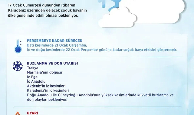 Meteoroloji Genel Müdürlüğü, 17 Ocak Cumartesi gününden itibaren Karadeniz üzerinden gelecek soğuk havanın ülke genelinde etkili olacağını duyurdu. Açıklamaya göre soğuk hava, batı kesimlerde 21 Ocak Çarşamba, iç ve doğu kesimlerde ise 22 Ocak Perşembe gününe kadar sürecek; birçok bölgede buzlanma ve don riski bulunuyor.