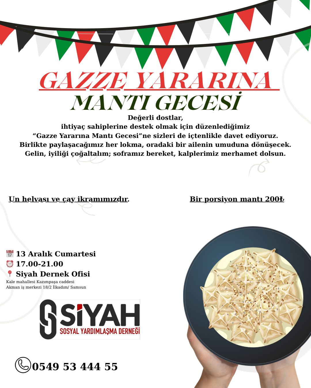 Samsun Siyah Sosyal Yardımlaşma Derneği’nden Gazze Yararına Mantı Gecesi Daveti