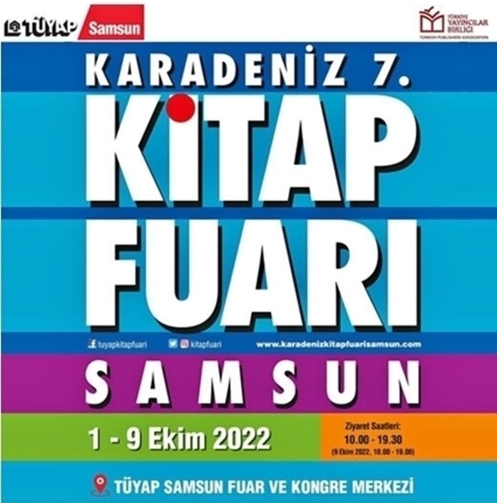 TÜYAP 7. Karadeniz Kitap Fuarı; 01/ 09 2022 tarihleri arasında; okurlarıyla buluşmanın sevinç ve heyecanını yaşıyor.Bu yıl ki TÜYAP Kitap Fuarı'na Samsun Yazarlar Derneği de 50'nin üzerinde şair ve yazarıyla fuara hazır durumda.Samsun Yazarlar Derneği Başkanı yazar ve şair Ahmet SEVEN; Samsun Bülteni adlı sitesinde; furlailgili olarak şöyle dedi:" Bugüne kadar 6.sı düzenlenen ve bu yıl 7. düzenlenecek olan Tüyap Karadeniz Kitap Fuarının heyecanı sürüyor.Karadeniz Kitap Fuarı Ülkemizin en büyük Kitap Fuarlarından birisi.Geçmişten bugüne Fuarlar Şehri olarak ’ta bilinen Samsunda düzenleniyor olması ayrı bir anlam taşıyor.Muhteşem bir organizasyonla gerçekleşiyor.Onbinlerce ziyaretçi tarafından geziliyor.Bu yıl 1-9 Ekim 2022 tarihleri arasında düzenlenecek olan fuarda kitapseverlerin Karadeniz buluşması yaşanacak." ( Yazının tamamını okumak için: http://www.samsunyazarlardernegi.com/haber-detay.php?haberid=17699TÜYAP, 7. Karadeniz Kitap Fuarı'na katılacak bazı şair ve yazarların isimleri şöyle:( sıralama Samsun Yazarlar Derneği'nin paylaştığı isim ve resimlere göredir )Ahmet Seven (SAY-DER Başkanı ), Doğan Kan( SAY-DER Bşk. Yrd. ), Volkan Çekirdek, Gülten Subaşı Kaya, İlkay Eyüpoğlu Odabaş, Adnan Öz, Bilsen Şahin, Nadime Çakır Pelit, Semra İplikçi, İbrahim Ünlü, Fatma Paksoy, Oktay Zerrin, Mevlüt Eşgünoğlu, Hasan Topuz, Ata Nuri Güler, Hilal Genç, Melahat Kanoğl u, Mehmet Alan( Birfani ), Halime Sel Özgen, İrfan Ertav, Hasan Akbaş, Celal Demir, Nermin Eker, Melek Başkan, Alaeddin Dursun, Tuba Devrim, Suat Eşitken, İlknur Damla Beytekin, Bengül Alkan.TÜYAP 7. Karadeniz Kitap Fuarı'na başka şair ve yazarların da katılımıyla sayının 50 ve üzerinde olması bekleniyor.Bazı yazar ve şairler ise; Samsun ve diğer illerde kitapları değişik yayınevlerince basılan ilgili yayınevlerinin standlarında kitaplarını okurlara imzalayacak.Ayrıca; Samsun Eğitim Derneği, Samsun Millî Eğitim Müdürlüğü, Edebiyat Nöbeti Dergisi ve Samsunlu Sanatçılar Derneği( SASAD) da; TÜYAP 7. Karadeniz Kitap Fuarı'ndaki standlarıyla yer alacak.Haber: Oktay ZERRİN- Samsun EĞİTİM